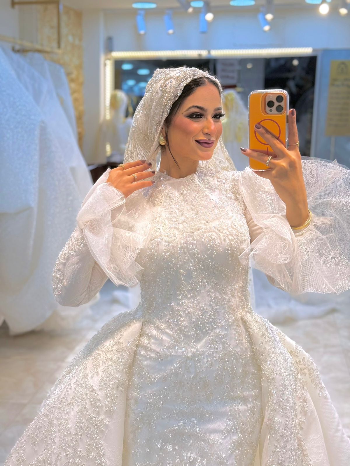 الجزء العلوي مصمم بقصة محتشمة مع أكمام طويلة شفافة واسعة بتفاصيل ناعمة تضيف لمسة أنثوية مميزة. أما الأكستنشن الخلفي فهو بلون شامبين متناسق، سهل التركيب والفك، ليمنحك حرية الحركة أثناء الحفل.