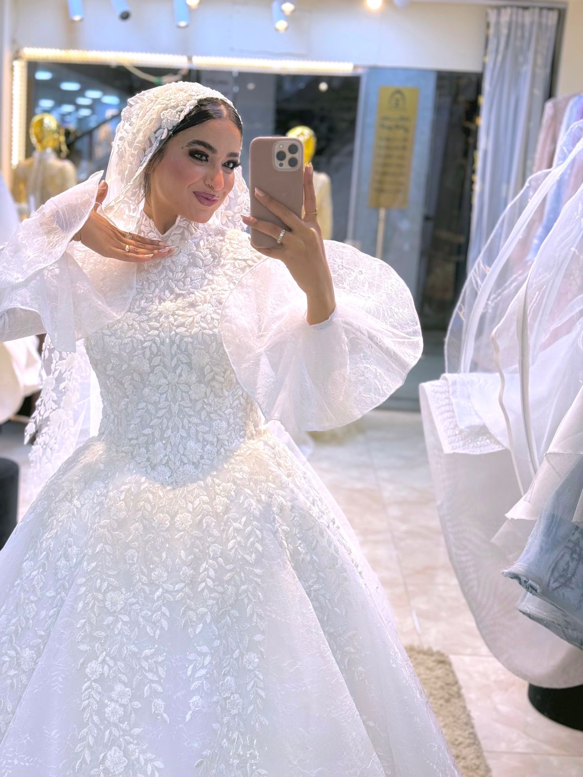 الفستان مزود بذيل طويل بطول 3 أمتار يمنح حضورًا مهيبًا في قاعة الزفاف، مع طرحة متناسقة مطرزة تكمل الإطلالة بشكل مثالي.